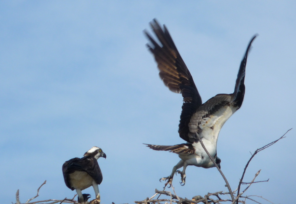 got of one osprey leaving the nest after having brought a pan sized fish for the other bird and the chick (head just visible under her legs). This is the first I’ve seen the chick — 9 June 2010.
