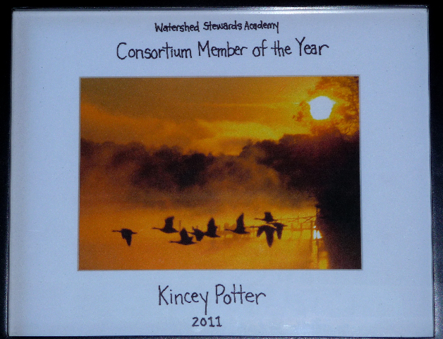 The second award — Kincey insists it was just a little thank your gift — was from a group that Kincey has worked with for only the past year: the [Anne Arundel] Watershed Stewards Academy, which is a new private sector group being organized to take over a former public initiative to train citizen-volunteers in actual land use practices and restoration activities (think rain gardens and rain barrels) to prevent and mitigate negative effects of development on watersheds throughout the county. Kincey was especially recognized for the major investment she has made over the past year to recruit and organize a high powered Board of Directors that can provide useful guidance and leverage for the activities of the volunteers trained by the Academy. In addition to the nice photo-plaque below, they gave her a book on the Chesapeake and a Cedar (maybe three). Very nice, and thanks guys.