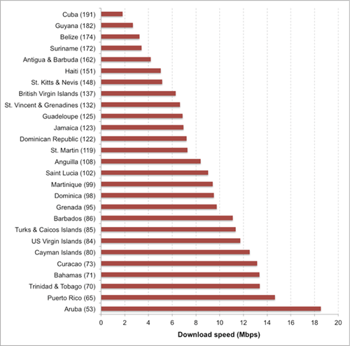 Figure 1: Mean household Internet download speeds in select Caribbean countries as of 17 March 2015 (Source: Ookla)