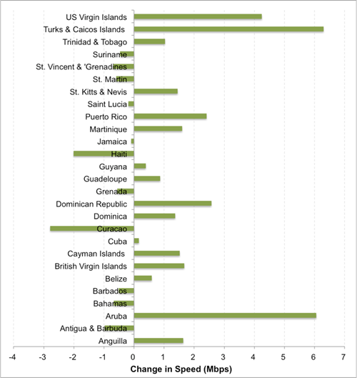 With regard to the changes in household download speed in individual Caribbean countries, they varied widely, as shown in Figure 2. The greatest increases in downloads speeds were recorded in the Turks and Caicos Islands, by +6.30 Mbps, and followed by Aruba, by +6.06 Mbps, and the Unites States Virgin Islands, by +4.25 Mbps.