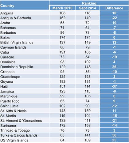 Figure 3: Change in mean household download speed ranking between September 2014 and March 2015 in select Caribbean countries (Source: Ookla)